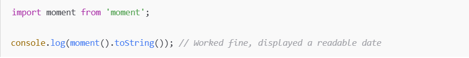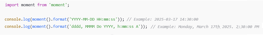We observed that moment() now requires an explicit format when formatting dates and times. Previously, it would default to a standard format, but in the updated version, omitting a format may lead to unexpected behavior.