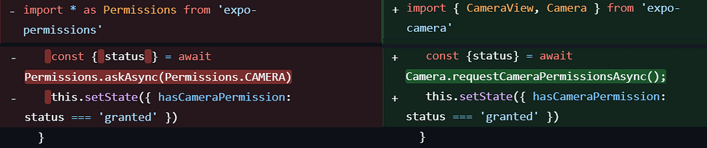 Previously, expo-camera used Permissions.askAsync from expo-permissions to request access. In Expo SDK 51, it now includes a built-in requestPermissionsAsync() method, removing the need for expo-permissions.
