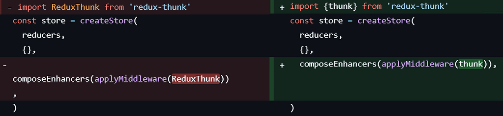 Before the update the redux-thunk exported thunk as a default export. After the upgrade, thunk is exported as a named export, which means you must import it using curly braces {} and the exact name