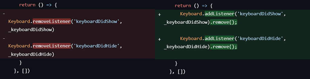After upgrading to Expo SDK 51, we encountered an error while trying to remove event listeners from the Keyboard module: