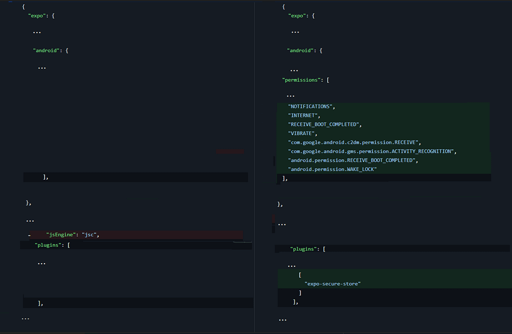 We updatedandroid permissions, removed explicit mention of jsEngine, as in Expo SDK 51 it defaults to Hermes and updated plugins.